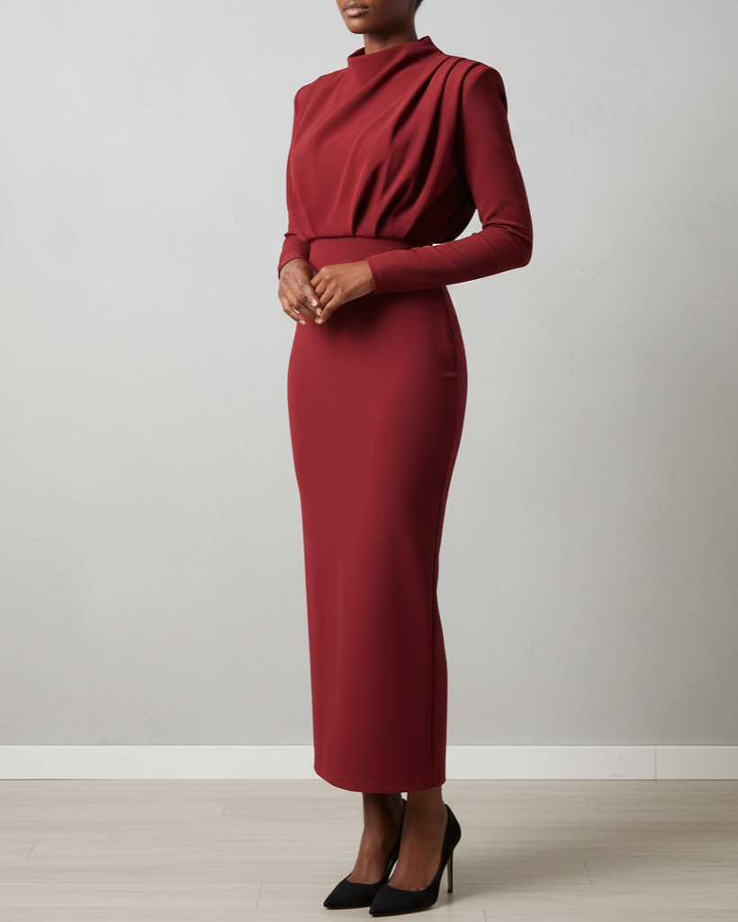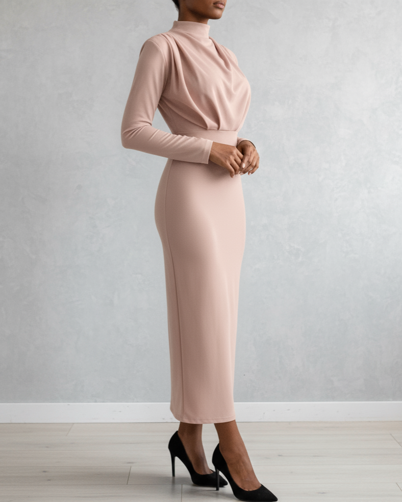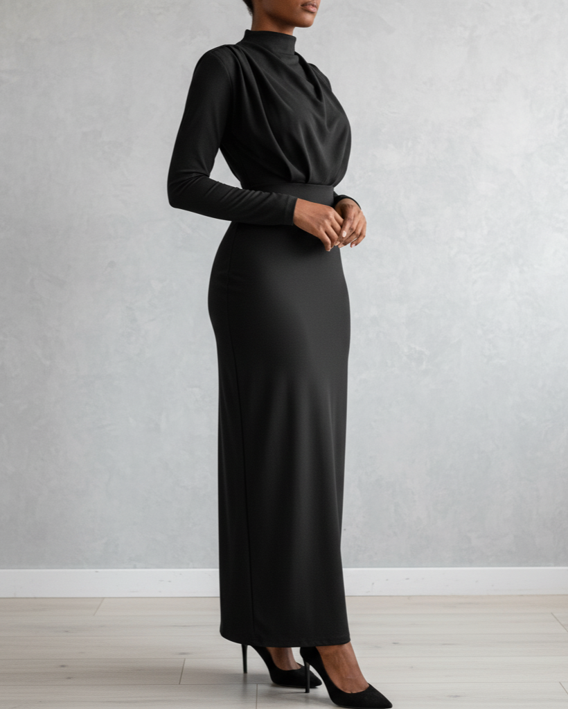 Este vestido largo con mangas largas está diseñado para un uso versátil. Ya sea que estés en movimiento, en el trabajo o tengas algo agradable planeado, este vestido se mueve contigo sin esfuerzo. Su corte recto y detalles sutiles lo hacen adecuado para diferentes momentos.